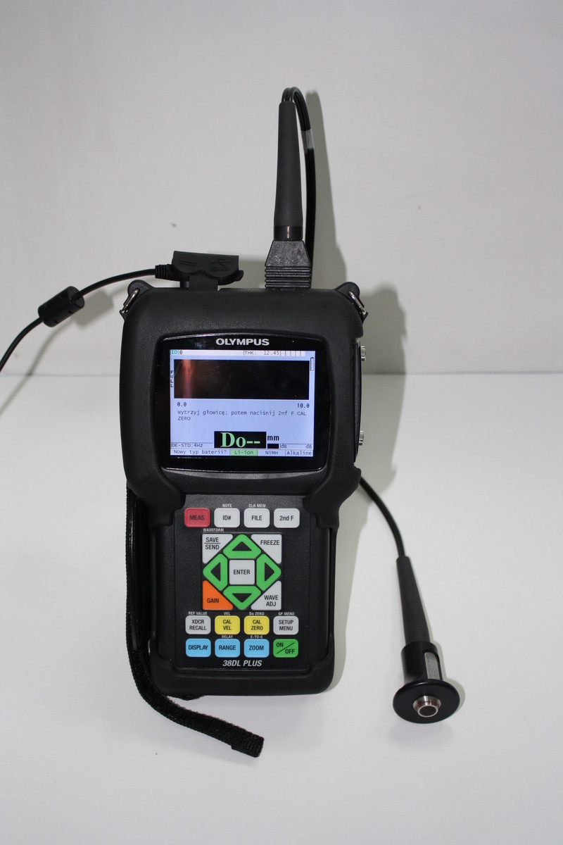 • Olympus 38DL PLUS ultrasonic thickness gauge. The device works with double and single heads. Corrosive thickness measurements with double heads, THRU-COAT and Echo-Echo measurements of painted or coated materials and much more.