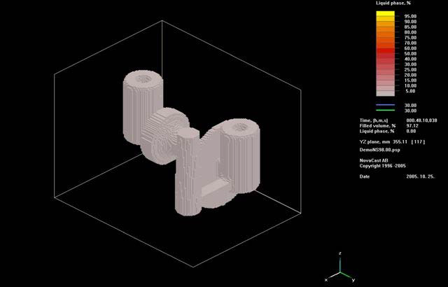 • Oprogramowanie NovaFlow & Solid umożliwia symulację procesu zalewania formy grawitacyjnej oraz ciśnieniowej. Symulację przeprowadza się na dowolnym stopie odlewniczym. Oprogramowanie umożliwia zmianę materiału z jakiego wykonano formę odlewniczą, pokrycia formy, osłonki egzotermiczne oraz izotermiczne. Symulację prowadzić można pod względem izoterm w odlewie lub formie, powstawaniu porowatości, szybkości stygnięcia.